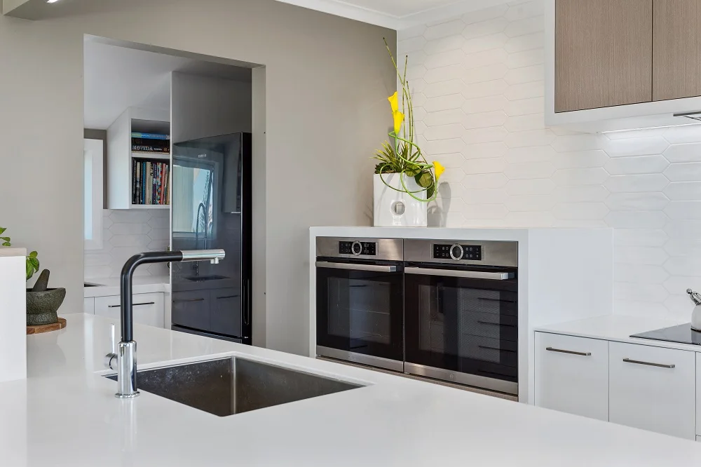 The coastal setting and a large open plan home required clean lines and a blend of sophistication and casual beach living. A framed nest of Oak over cupboard doors was the only non-white element introduced into the kitchen. For the ‘wow’ factor the design relied on the geometrical shapes and material contrast.